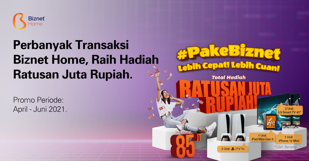 #PakeBiznet Lebih Cepat! Lebih Cuan! merupakan salah satu program promo Biznet, dimana pelanggan yang meningkatkan transaksi pembayaran layanan Biznet Home selama 3 bulan selama masa periode promo sejak April – Juni 2021, berhak mendapatkan kesempatan untuk memenangkan berbagai hadiah berupa uang tunai jutaan rupiah, PlayStation 5, iPhone 12 Mini, iPad Mini Gen 5, dan Smart TV 43”.